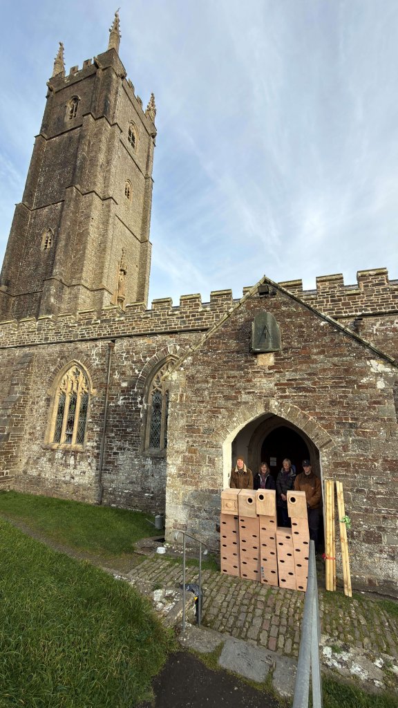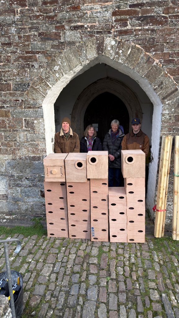 More often than not, jackdaws will use church towers for nesting and they’ll go to great lengths to secure their twiggy nests to anything they can, especially the louvres and mesh (installed to keep them away!).  Over time, their twig twiddling ways can poke holes in the mesh and they’ll gain entry and make a lovely mess in the bell chamber.  I’ve surveyed towers where a couple of twigs halfway up the stairwell turned into a waist deep twig wading fest amongst the bells.  Left unmanaged, this will occur.  However, maintained meshwork will prevent this.  But what if you’d like to be non exclusive and provide for swifts and jackdaws?  Well, that’s what the Hartland Nature Society requested.  So after consultation with a jackdaw specialist, Guill McIvor, I made 4 dedicated jackdaw nestboxes for the north louvre, and 42 swift nestboxes for the 3 other elevations.  Guill confirmed that swifts are really not on the menu for jackdaws, which have a distinct preference for grain.  Good news!