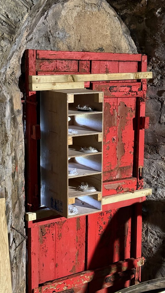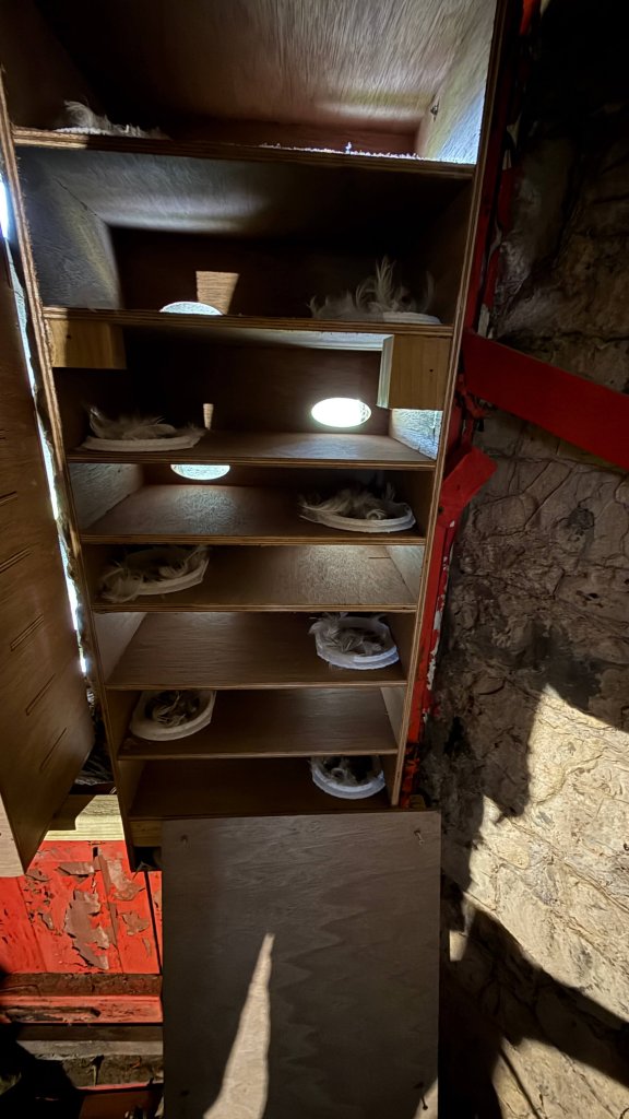 Jackdaw nestboxes installed, they are much larger chambers than swift (3X) nestboxes with an 80mm diameter access hole.  The base of the box needs to be ‘keyed’ and not smooth otherwise the chicks may develop splayed legs on the slippery plywood which can trouble the birds for life.  Fledging can be difficult, as can perching.  Who knew?  Thanks for the expertise Guill.